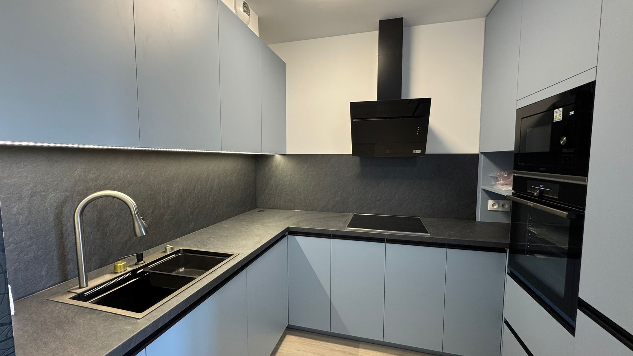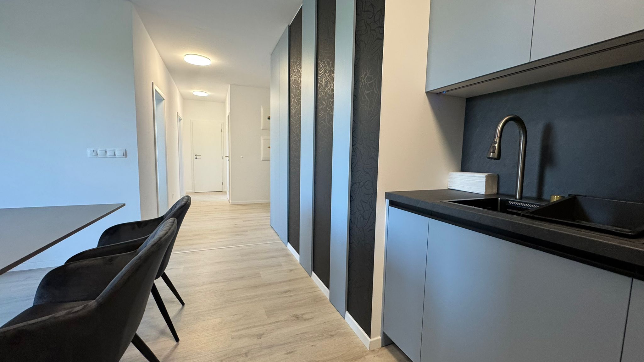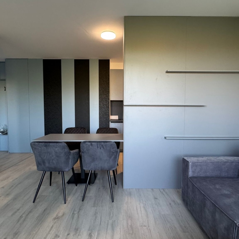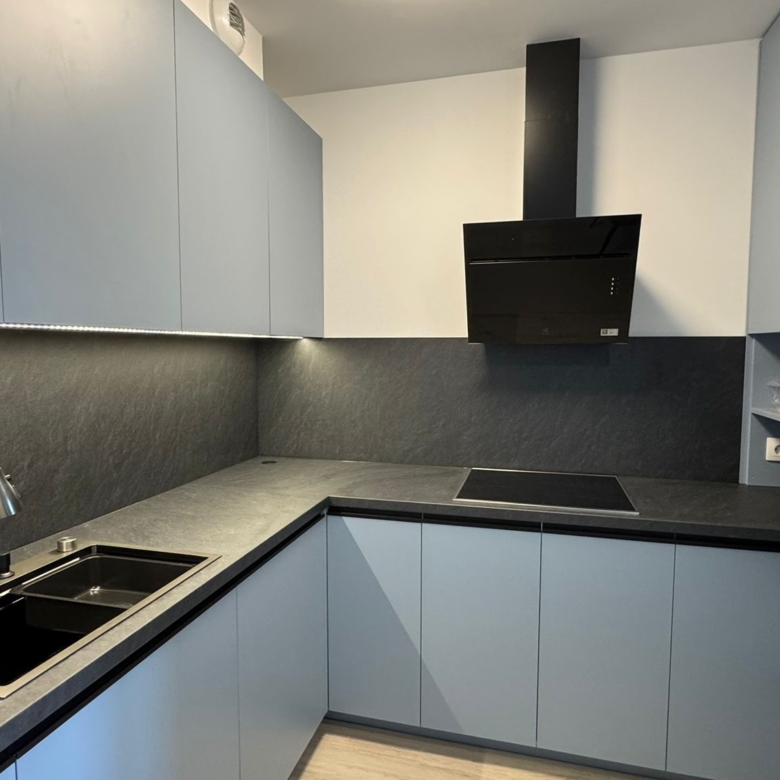úplne nový, nabytok zariadený na mieru (kuchyňa + vstavané úložné priestory)